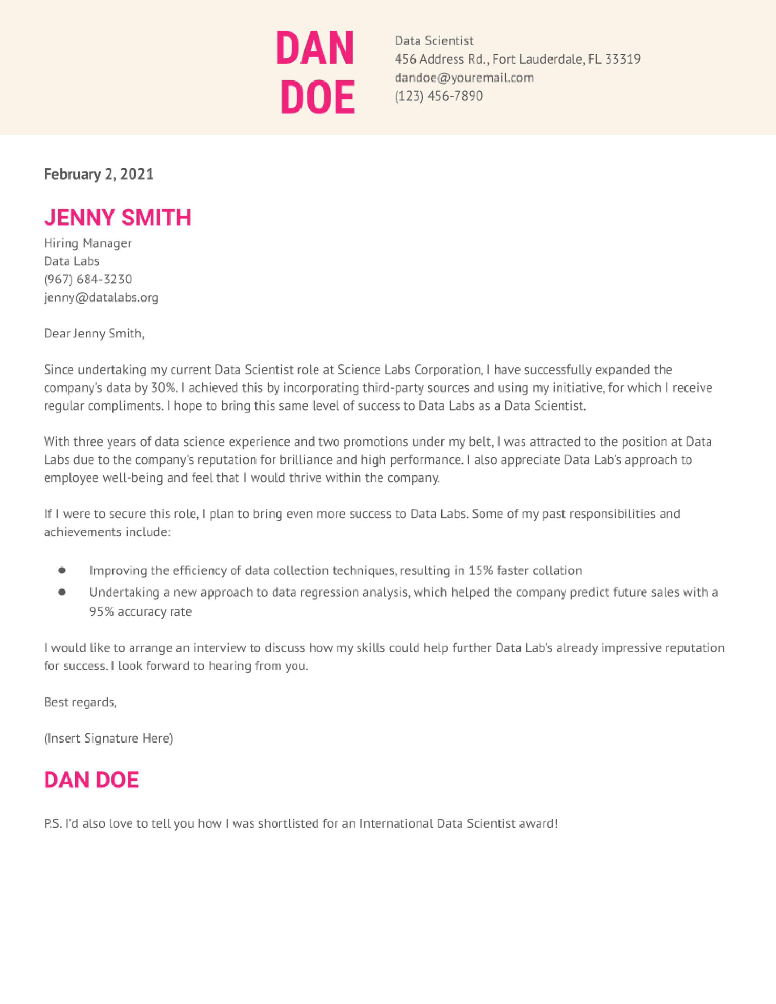Real Data Scientist Cover Letter Example For 2023
